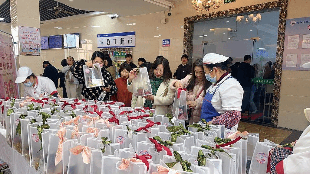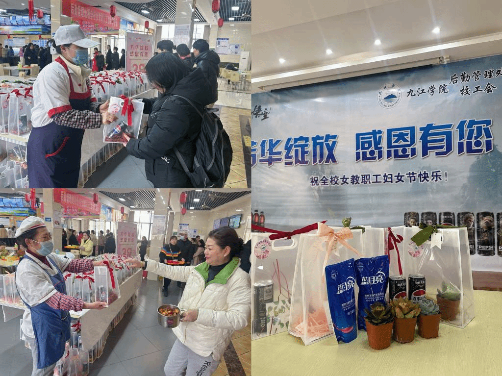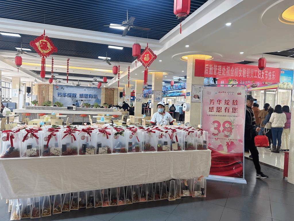 为庆祝第115个"三八"国际劳动妇女节,校后勤管理处联合校工会在食堂开展“芳华绽放感恩有您”主题活动,为节日期间坚守岗位的女教职员工送上节日祝福与暖心福利,传递校园温情。