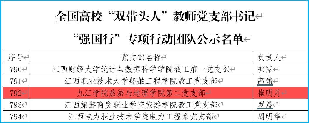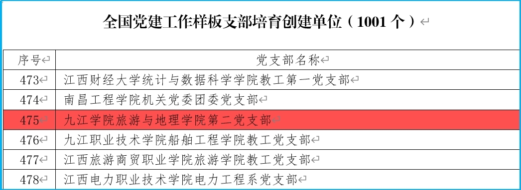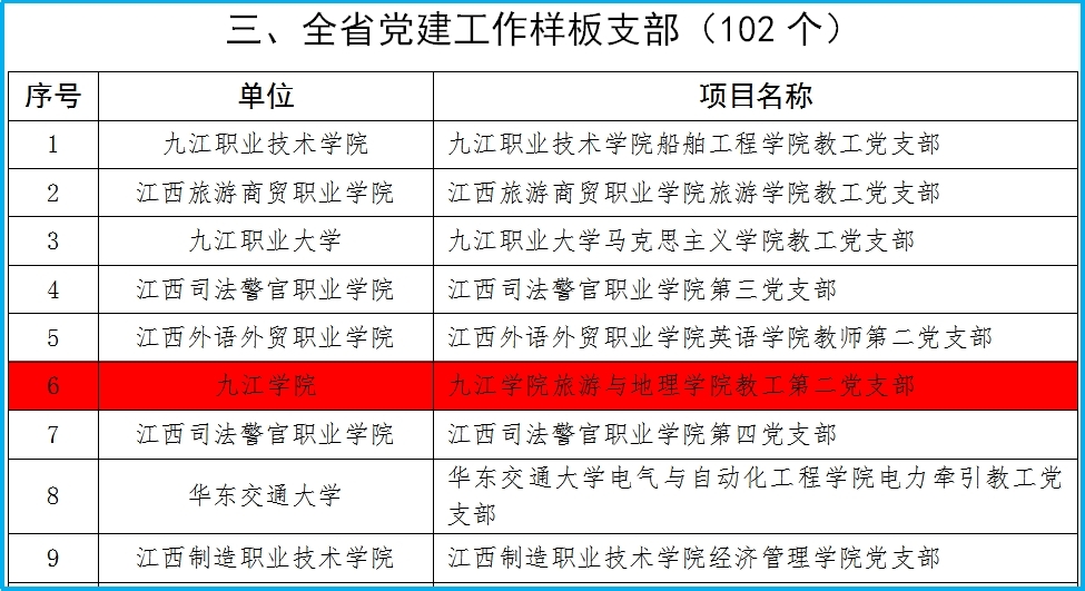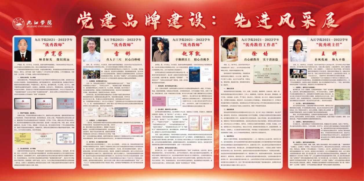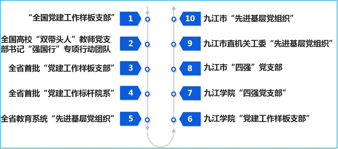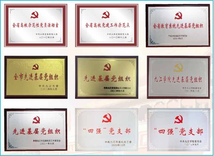 教工第二党支部2021年荣获全省教育系统“先进基层党组织”和九江市直机关工委“先进基层党组织”称号;2022年荣获九江市直单位“四强”党支部称号、Ky开元集团“四强”党支部称号;2023年获批江西省首批“全省党建工作样板支部”;2024年获批第四批“全国党建工作样板支部”培育创建单位、全国高校“双带头人”教师党支部书记“强国行”专项行动团队、Ky开元集团“先进基层党组织”称号。