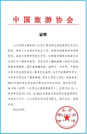 学院为江西省旅游学会副会长单位、中国旅游协会旅游教育分会常务理事单位、江西省旅游协会旅游教育分会副会长单位、江西省地理学会副理事长单位、教育部旅游管理专业国家虚拟教研室TOP100成员院校、九江市研学旅行学会副会长。为教育部“1+X”旅行策划等职业技能等级证书试点院校,连续数年被评为优秀考点。拥有江西长江经济带研究院(江西省哲学社会科学重点研究基地)、旅游发展研究中心、江西传统村落发展研究中心等科研机构;拥有江西濂溪茶科技小院(国家级)、现代文旅产业学院等产学研平台。