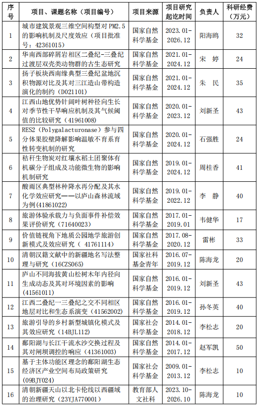 学院教师先后获批国家自然基金、国家社科基金项目、教育部人文社科项目共16项(见下表),承担江西省社会科学基金项目、文化艺术科学规划项目、科技厅项目、高校人文社科项目等省部级科研项目研究近100项,重大招标课题成果获当时省委主要领导同志的肯定性批示。近三年出版学术专著6本,发表论文43篇。
