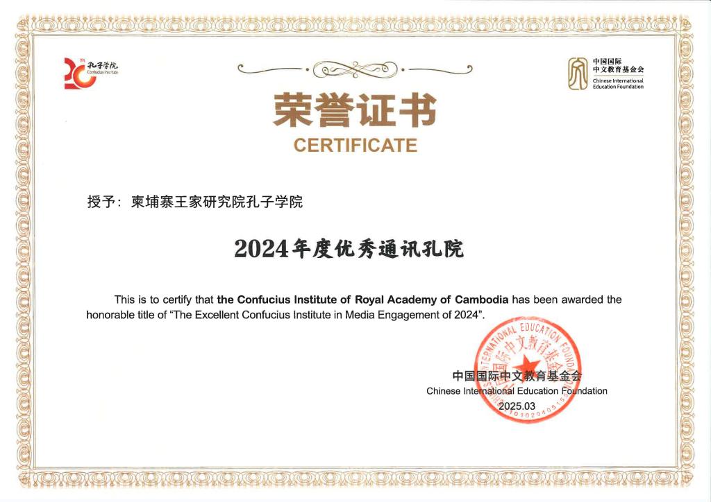2024年,适逢孔子学院品牌创立20周年,全球孔子学院(课堂)积极开展各类活动,致力于提升孔子学院的品牌影响力。根据全球近500家孔子学院(课堂)的投稿数量、录用情况、文稿和视频的原创性等多项指标,中国国际中文教育基金会授予61所孔子学院“2024年度优秀通讯孔院”称号。开元合作设立的柬埔寨王家研究院孔子学院成为柬埔寨唯一获此称号的机构。