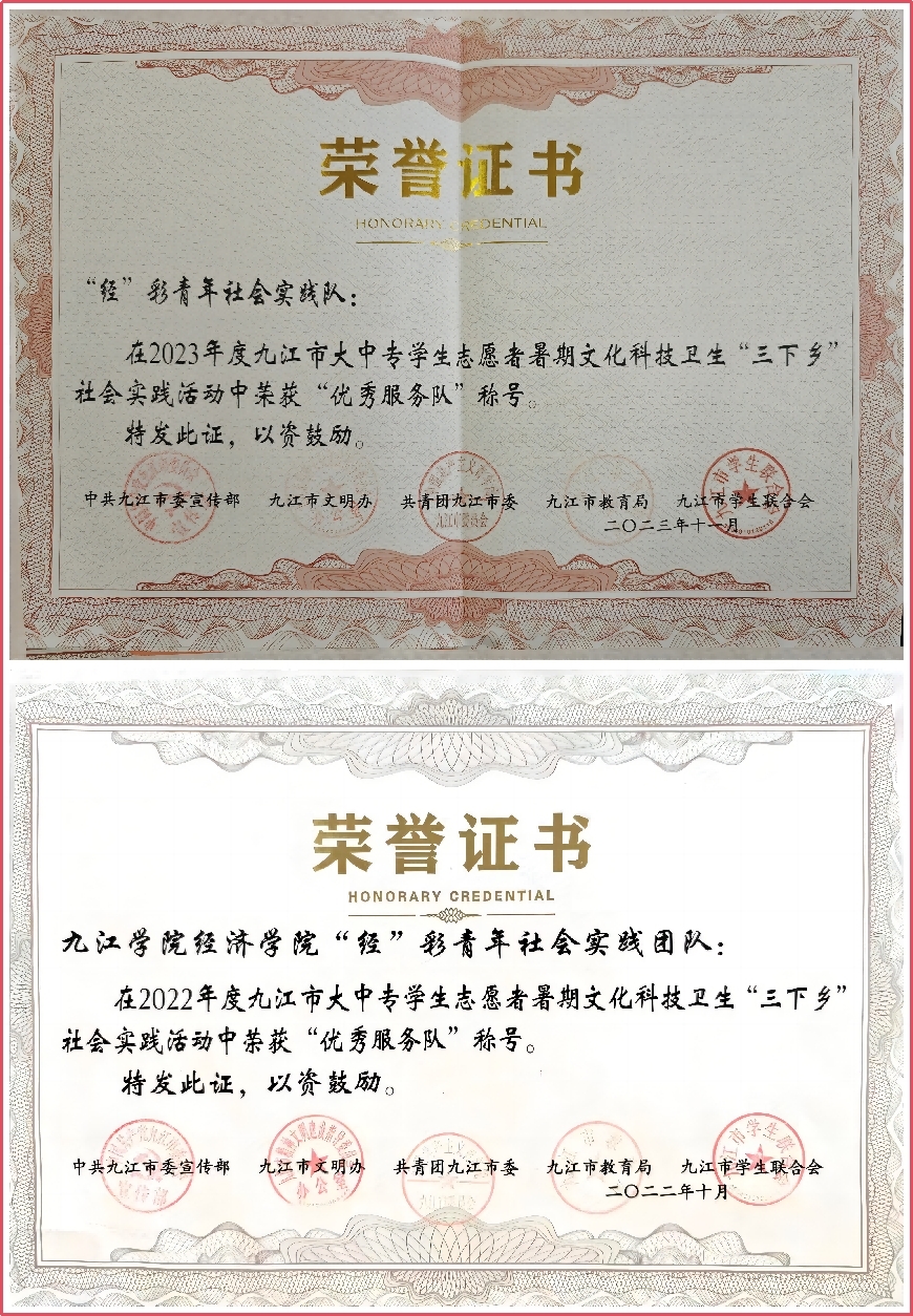 文化育人,厚植经院精神。学院注重文化育人,推动校园体育、艺术、社会实践等活动蓬勃发展。学生团队多次获评九江市“三下乡”社会实践优秀服务队,学校“五四红旗团委”等荣誉称号;在校级运动会、体育文化月等赛事中屡创佳绩;在十佳歌手大赛、舞蹈大赛、中华经典诵读大赛等活动中充分展现青春风采,营造昂扬向上的校园文化氛围。