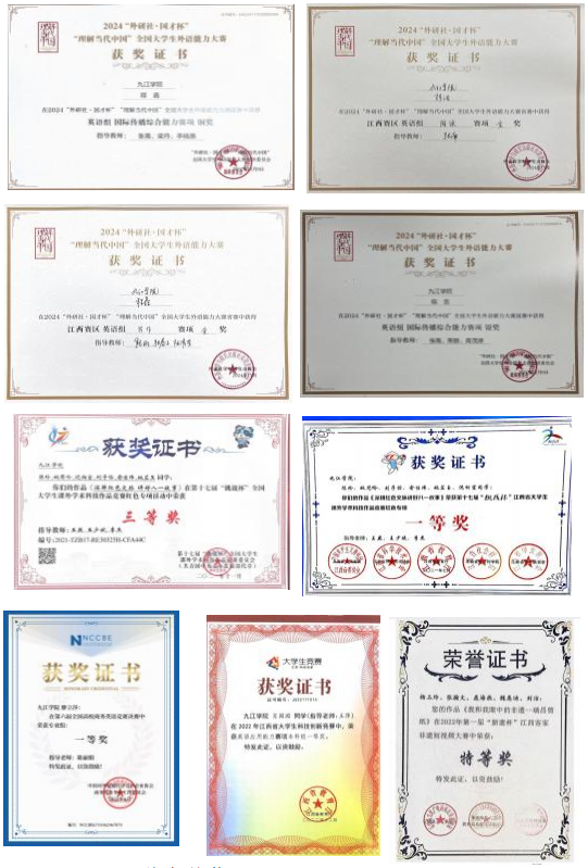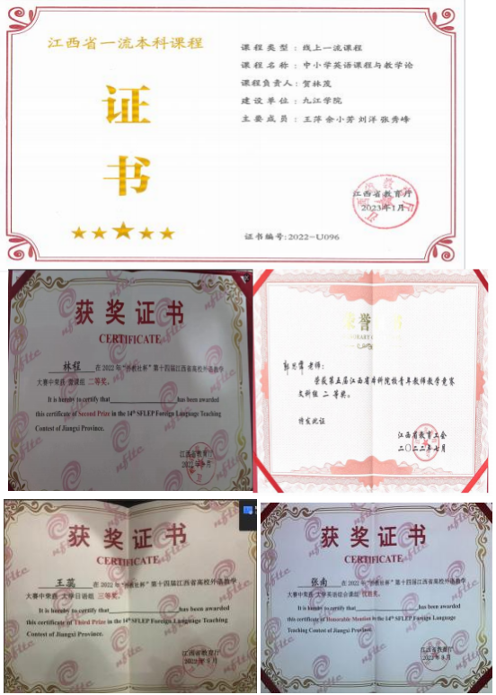 “田家炳”杯全国师范生技能大赛颁奖、孔启惠参加中国日报社“21世纪杯”全国英语演讲比赛、学生获奖证书、江西省“燕兴杯”团体总分第一