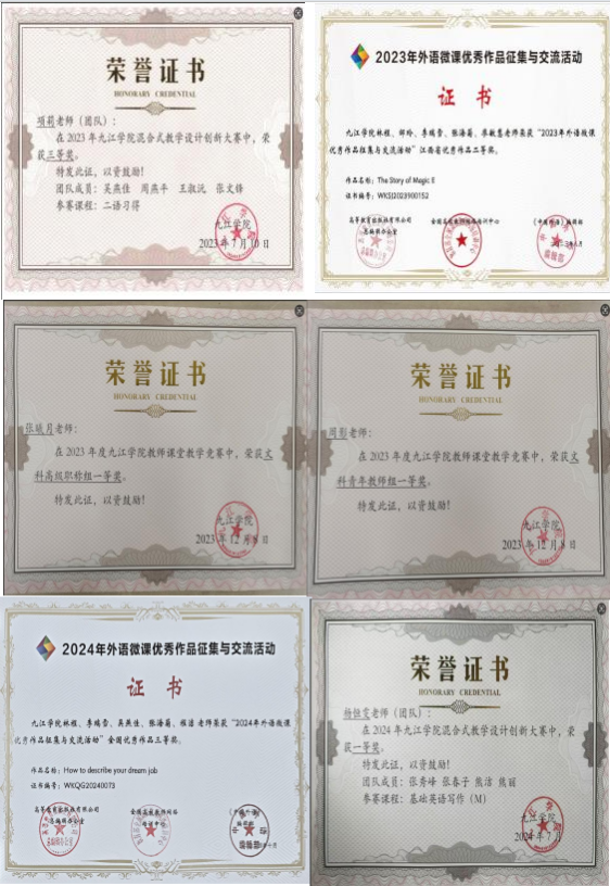省级一流本科课程立项证书、教师教学竞赛获奖证书