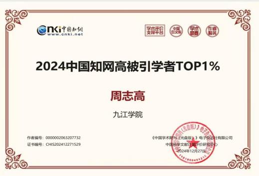周志高入选“2024 中国知网高被引学者TOP1%”证书