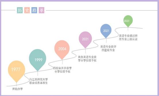 【历史沿革】外国语学院始建于1977年,1999年与江西师范大学联合培养本科生,2004年由九江军需财专外语系、九江师专外语系、九江医专英语教研室和九江教育学院英语教研室合并成立,并获学士学位授予权。学院现为江西省大学外语教学研究会副会长单位、江西省外语学会副会长单位、江西省翻译协会理事单位及江西省文艺学会比较文学与跨文化研究专业委员会副会长单位,在学术研究与人才培养方面影响广泛。