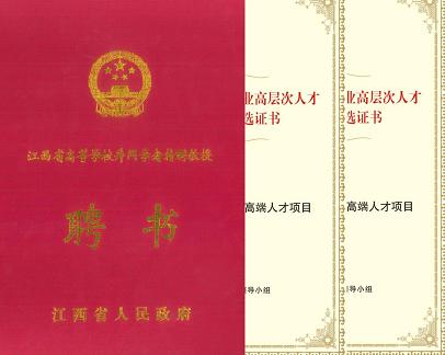 荣获江西省高层次人才称号证书