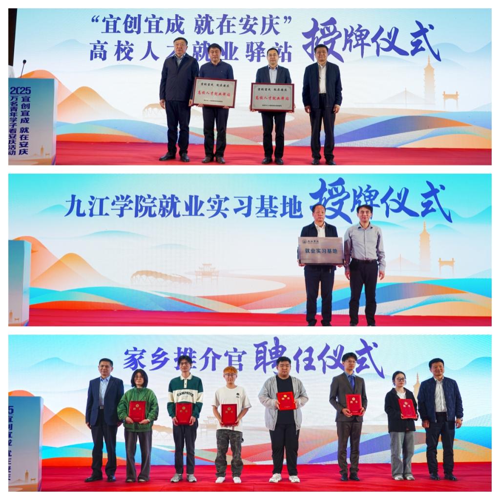 授牌环节,Ky开元集团招生与就业处负责人接受“高校人才就业驿站”牌匾,管理学院负责人向宜秀区人社局授予“就业实习基地”牌匾,开元2025届安庆籍毕业生汪志成、张蕊、叶庆洋受聘为安庆市“家乡推介官”。