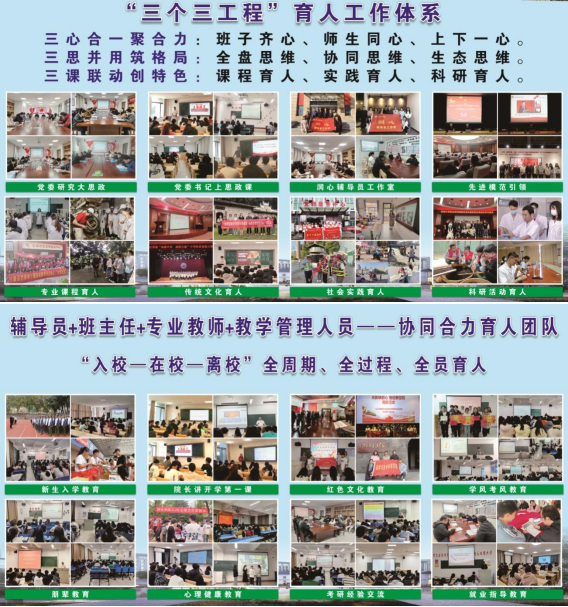 学院在深化三全育人过程中,构建"三个三工程"育人体系,形成"三心合一聚合力、三思并用筑格局、三课联动创特色"的协同育人模式。其中,“三心合一”强化组织保障,构建班子齐心、师生同心、上下一心的同心育人体系,形成聚指成拳的育人合力,切实将“为党育人、为国育才”的使命转化为育人实践。“三思并用”优化育人生态,构建全盘思维、协同思维、生态思维的三维认知框架,形成横向到边、纵向到底的育人矩阵,实现教育时空全覆盖。“三课联动”打造育人闭环,以专业课堂强基固本,活动课堂淬炼能力,学术课堂培优创新,形成“理论认知-实践深化-创新升华”的三阶育人课堂。关注人才培养时间序列,建立“教学管理人员+辅导员+班主任+专业教师”全员合力育人团队。辅导员聚焦思想引领,班主任强化成长导航,专业教师深耕学术指导,管理人员优化服务保障,打造全员全过程全方位衔接的教育链条,完善从入校到离校全过程教育体系。