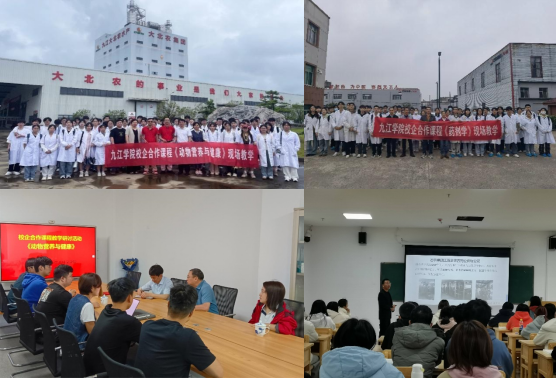 引企驻校,铺建校企合作新路。学院与九江博莱农业集团、江西仙客来生物科技有限公司、九江礼涞生物科技有限公司、江西丹霞生物科技有限公司、九江星祥水产养殖有限公司等在校内合作共建九江市博正生物科技产业研究院、江西九祥水产产业发展研究院、庐山生物与医药现代产业学院,在科学研究、成果转化、师资建设、人才培养、社会服务等方面深度合作;与石药集团江西金芙蓉药业有限公司、九江正大饲料有限公司等共同探索人才培养,企业行业专家参与授课和人才培养方案修订,合作建设专业课程,共建校外实习基地。