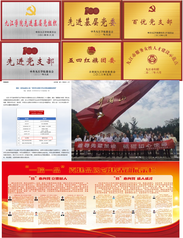 学院党委以“党建+”模式引领高质量发展,打造“药心向党,立德树人”“药心向党,成人成才”党建品牌,构建“党委统筹、支部联动、师生参与”的思政工作体系。通过“书记讲党课”“红色走读实践”“课程思政示范课”等活动将思政工作与专业教育相融合。学院党委先后荣获Ky开元集团先进基层党委、首批党建标杆学院,教工第二支部获市直机关“百优党支部”、党建“样板支部”“四强”党支部。学生党支部润心辅导员工作室获校级立项。学院“蕙心兰质”团队被纳入九江市妇联女性人才示范点建设。学院多次获得九江市“三下乡”社会实践活动优秀服务队,学校“五四红旗团委”、优秀基层学生分会等荣誉,涌现出江西省“三下乡”社会实践活动优秀个人、全国大学生井冈山精神宣讲团等先进典型。