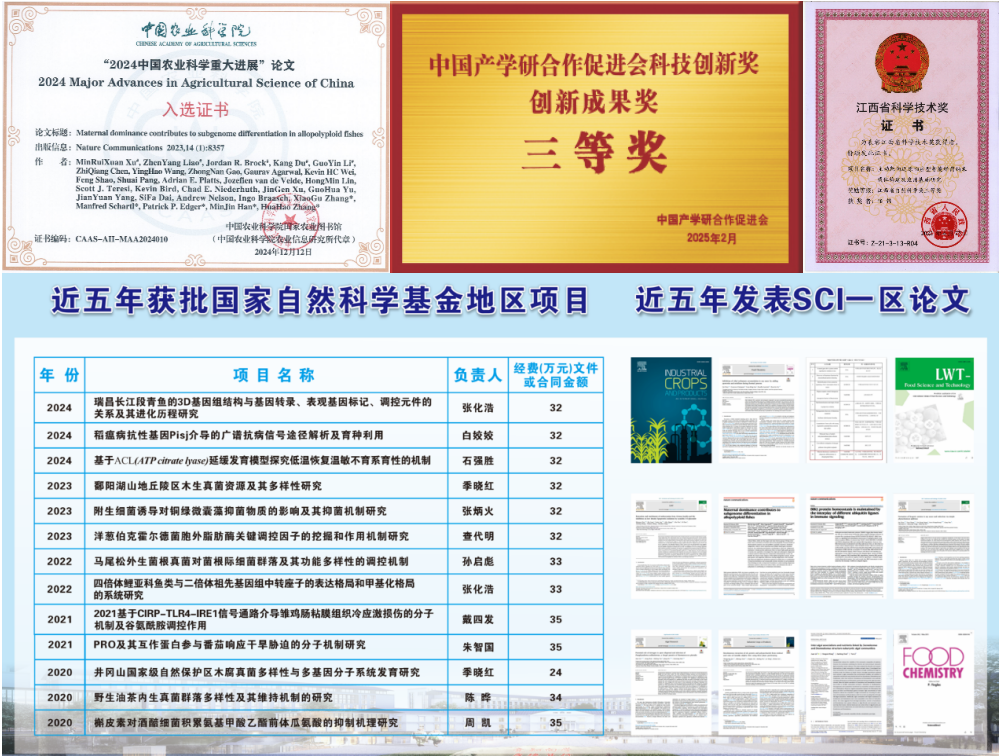 教师主持立项市厅级以上纵向项目90余项,经费1100余万元,其中国家自然科学基金项目12项。主持立项横向项目30余项,经费500余万元。发表论文130余篇,其中SCI收录77篇。获授权专利48项,其中发明专利34项。鲤科重要经济鱼类保护及开发研究团队在《Nature Communications》期刊发表的研究成果“Maternal dominance contributes to subgenome differentiation in allopolyploid fishes”入选2024年中国农业科学十大进展。荣获江西省自然科学奖三等奖1项,中国产学研促进会产学研合作创新成果奖三等奖1项。打造了一支师德高尚、学术精湛、结构合理的高水平师资队伍。