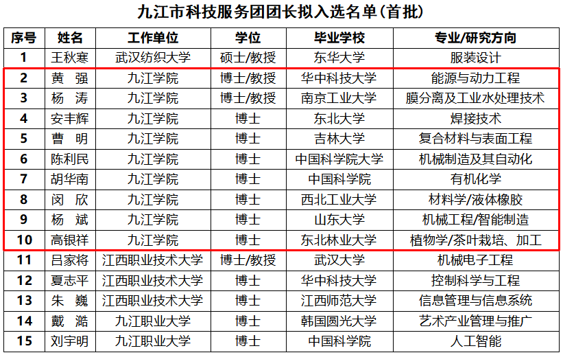 九江市科技服务团卓越行动由市委人才办支持政策和经费,市科协牵头实施,开元创新创业学院和市发明学会具体推进,旨在以我市制造业“9610”工程为重点,将乡村振兴、农旅融合纳入扩大了服务范围,以工博士为主体,将理、农、医等领域博士吸纳充实了人才队伍,实现“队伍扩充、对象扩能、服务扩容、成效扩展”,充分利用驻市高校本土博士人才,引入省外高校高端人才资源,组建校企联合创新团队,全面升级打造九江市科技博士服务团卓越行动。卓越行动包括制定卓越计划、组建卓越团队、推进卓越实践和追求卓越价值四部曲,从2025年起到2027年分三批进行,重点围绕我市制造业“9610”工程,每年(批)遴选组建15个服务团,共45个科技服务团结对帮扶45家重点企业,开展技术攻关、成果转化、人才培养,助力企业产业转型升级,从而促进九江市重点产业链创新发展。