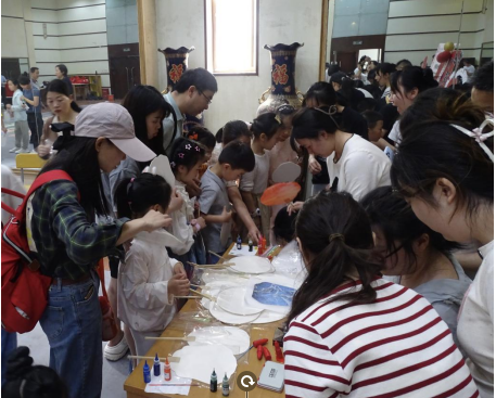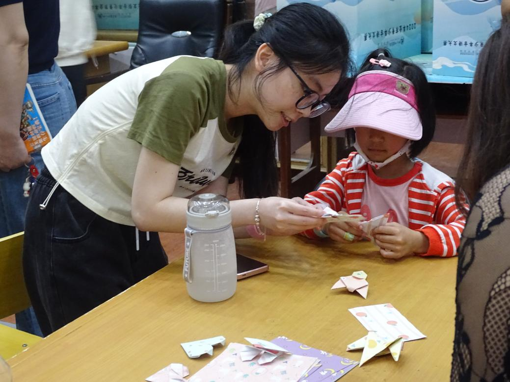 随后的“童话工坊”与“故事魔法屋”环节中,同学们分组引导亲子家庭参与手工创作与绘本共读。在折纸与漆扇制作中,孩子们用彩纸与画笔勾勒心中的童话角色,锻炼动手能力与想象力;讲解员以《小鳄鱼快乐学分享》等绘本为载体,通过趣味问答与魔法盖章互动,将阅读转化为充满挑战的“知识闯关”,让孩子们在游戏中理解分享、合作等美好品质。