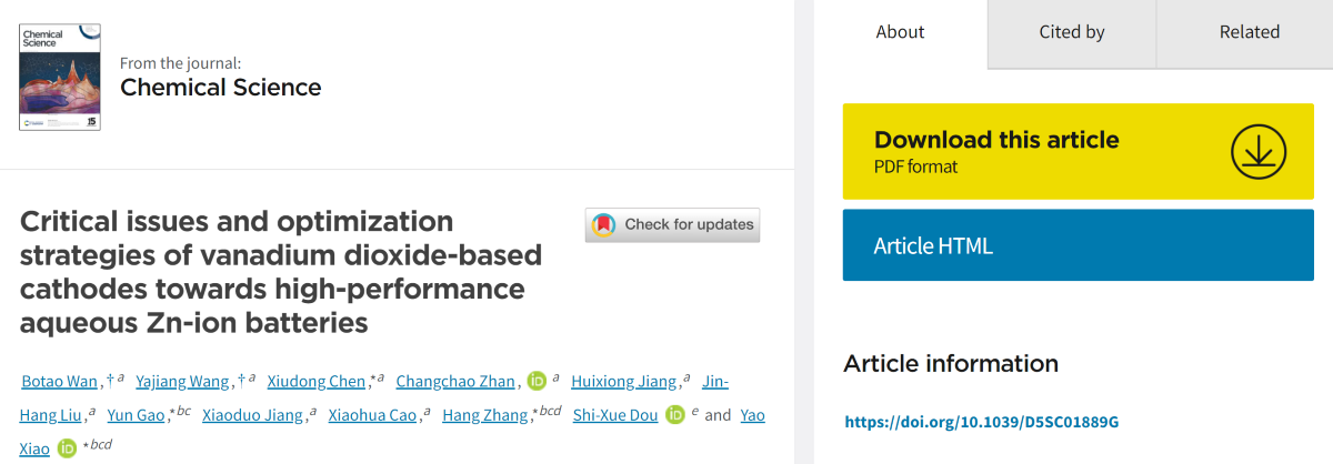 近日,在化学化工学院陈修栋教授团队的精心指导下,开元材料化学专业A2341班万博涛同学以第一作者身份,在《Chemical Science》(化学科学)上发表题为“Critical Issues and Optimization Strategies of Vanadium Dioxide-Based Cathodes Towards High-Performance Aqueous Zn-Ion Batteries”的综述性学术论文。