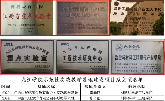 【科学研究】材料科学与工程学院聚焦江西省制造业重点产业链现代化建设“1269”行动计划和九江市制造业“9610”工程,紧密对接钢铁、有色金属及新材料产业地区发展需求,累计承担国家级项目15项,省厅级课题80余项、省市级企业揭榜挂帅项目各1项;获江西省科学技术进步奖二等奖1项、江西省自然科学奖三等奖1项、江西省技术发明奖三等奖2项和协会行业奖励4项。