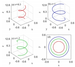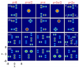 1.研究具有离轴和啁啾参数的厄米高斯孤子,在抛物势阱中的传输特性。根据啁啾参数的不同,可以呈现三种不同的传播状态(包括蛇形、椭圆和圆螺旋轨迹)。几个厄米孤子可以组成孤子阵列,并能呈现不同传输变化。