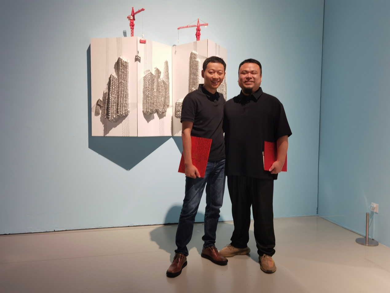 艺术学院教师谭丹武毕业于中央美术学院,其获奖作品陶瓷雕塑《大国筋骨——城市天际线》是其近几年“筋骨”系列作品的延续。灵感源自陶瓷印坯工艺内部的支撑结构,称之为“筋”,这种骨架结构与现代建筑中的钢筋水泥具有相同的功能。作品以中国城市中的现代建筑为创作对象,旨在呈现新中国成立以来在城市建设中取得的瞩目成就,见证大国建造和中国速度的辉煌成果。顶部的塔吊加入了动态装置,能更生动形象地展现出建设过程的活力与动态。创作采用手捏成型的方式,这能更好地表现泥土本身的材料语言,通过透视线的延伸处理,加强对作品空间的想象力。作品中线条的造型语言、黑白的东方美学、留白的画面意境、屏风的折叠效果等都展现对中国传统艺术和审美的思考。