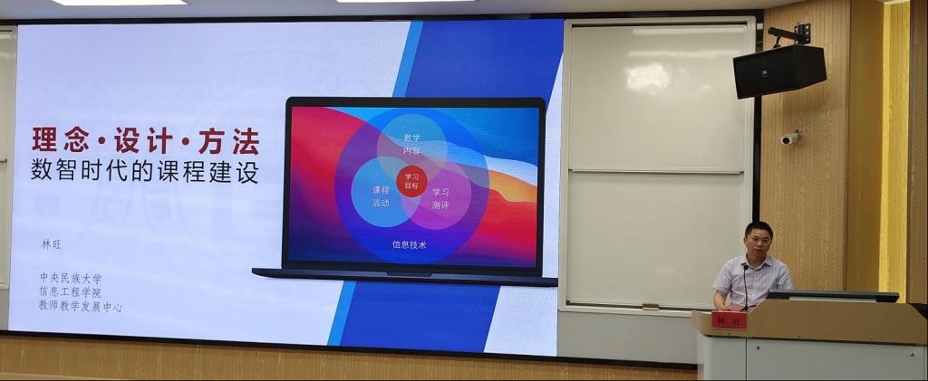 讲座中,林旺教授以《理念·设计·方法-数智时代的课程建设与教学创新》为题,以“信息技术时代教师知识结构模型”为切入点,紧密结合当前教育数字化发展趋势,阐释了数智时代对高等教育课程建设与教学模式带来的深刻变革与挑战。他围绕智慧课程的核心内涵、设计逻辑与实施路径,深入剖析了如何将人工智能技术有效融入课程目标设定、教学内容组织、教学活动设计、教学环境构建、学习过程支持及评价反馈等关键环节。林教授强调,智慧课程建设要以学生发展为中心,以智能化技术为支撑,重构教与学的关系,其精髓在于利用AI实现精准化教学、个性化学习和智能化评价。讲座内容翔实、案例生动,为参训教师提供了数智时代课程改革创新的清晰蓝图和可操作性路径。