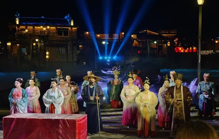 6月22日,服务队首站走进流坑古镇,沉浸于大型实景演绎《流芳》中的傩舞盛宴。舞者们头戴神秘面具,身着绚丽服饰,在激昂鼓点中跃动于古建之间,展现这一国家级非遗的古老魅力。《流芳》团队大胆创新,将傩舞的刚劲动作融入现代叙事—诠释抗争,传递温情。志愿者们深受触动,见证了传统文化在现代舞台焕发新生,为“活态传承”提供了范例。