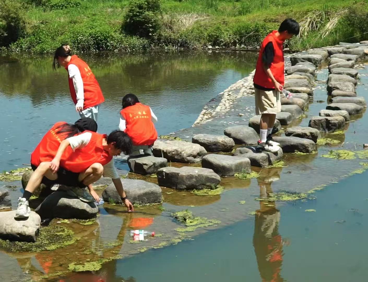 6月25日,服务队转战乌江河畔古樟树林。9名志愿者化身“生态卫士”,俯身清理河道垃圾。他们在虬枝如龙的百年古槐下细致搜寻塑料残片、烟头易拉罐,不放过任何角落。清理间隙,队员们积极向村民游客宣讲环保与防溺水知识,吸引了林间嬉戏的孩童。夕阳下,汗水映着余晖,清浅的乌江水拥抱着樟树倒影,与岸上“绿水青山就是金山银山”的金色标语交相辉映,见证青春守护的承诺。