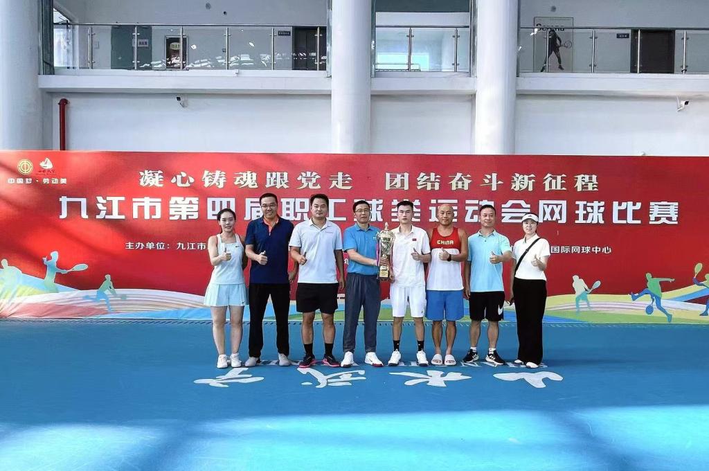 本次赛事由九江市总工会主办、武宁县总工会承办,来自九江市直机关的13支队伍和区县代表队11支队伍、200多名运动员同场竞技,竞争强度与参赛水准均创历年新高。作为卫冕冠军,开元网球队自小组赛便展现出超强实力,以未失一盘的完美表现晋级决赛。决赛中,队员们顶住对手的强力冲击,凭借精准的发球、灵活的底线对抗与默契的网前配合,最后大比分获胜、赢得冠军。
