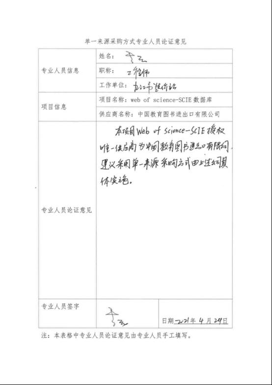 采用单一来源采购方式的原因及说明:该项目“web of science-SCIE数据库”授权唯一供应商是中国教育图书进出口有限公司,符合政府采购只能从唯一供应商获得单一来源采购情形,建议采用单一来源采购方式,由中国教育图书进出口有限公司负责实施。